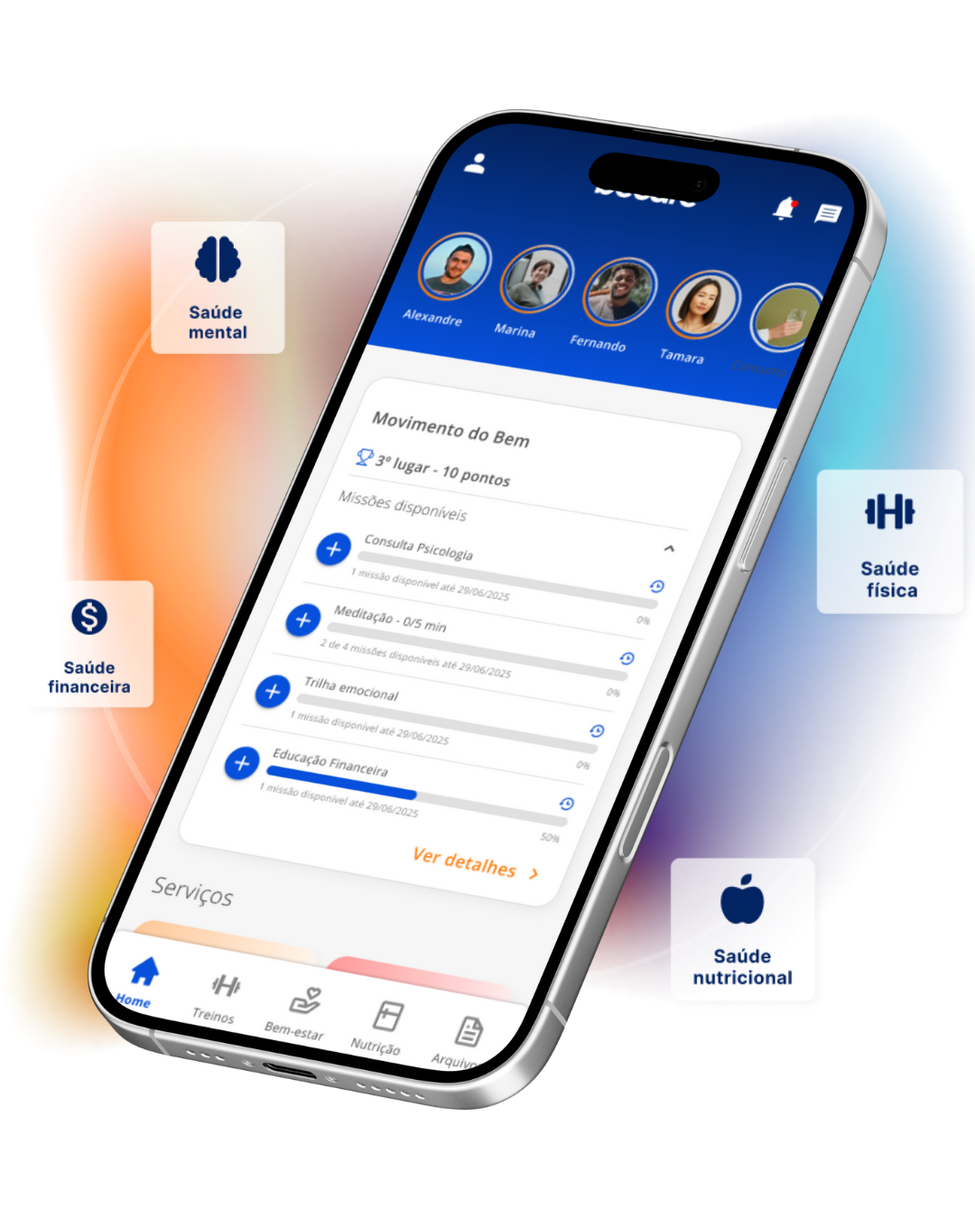 Crie uma cultura de saúde e bem-estar. Nossos programas de saúde ocupacional combinam ações motivacionais, gamificação e acompanhamento contínuo, tudo em um ambiente digital.